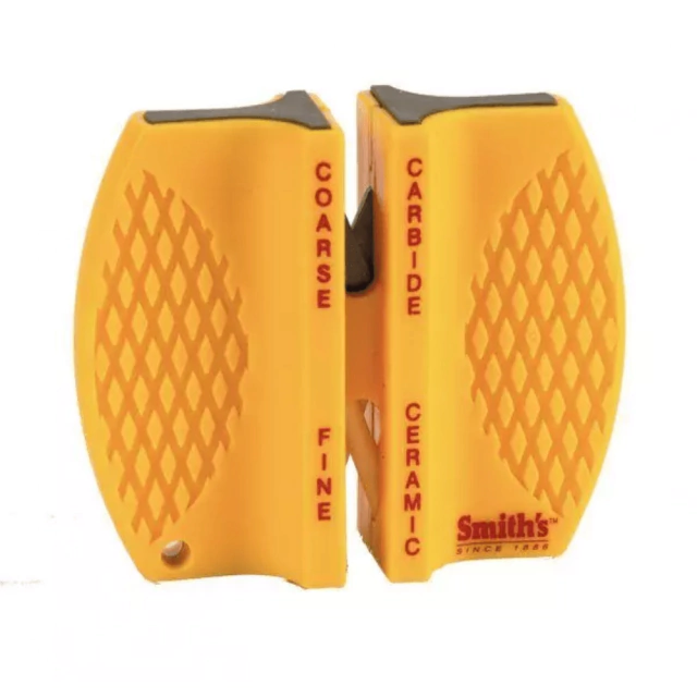O afiador de faca de 2 etapas da Smith apresenta duas lâminas de carboneto de tungstênio com ângulos predefinidos para garantir a aresta perfeita sempre. Três ou quatro golpes através das ranhuras de afiação de carboneto irão restaurar a borda em uma faca muito cega. As duas hastes de cerâmica cruzadas também têm ângulos predefinidos e fornecem um acabamento liso para facas já afiadas. É leve, portátil, vem com um orifício de corda e possui pés de borracha antiderrapantes para maior segurança. Excelente para uso em todos os tipos de facas, especialmente facas de filé.